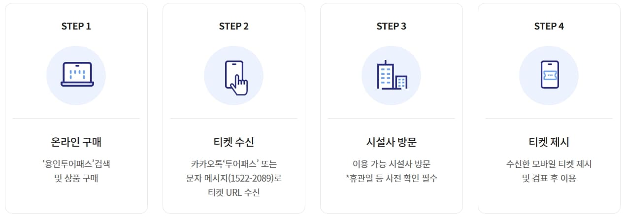 • 용인투어패스 + 에버랜드 : 에버랜드 이용 시 모바일 티켓 내 사전예약 필수, 실제 인원수에 맞춰 구매, 2인 이상