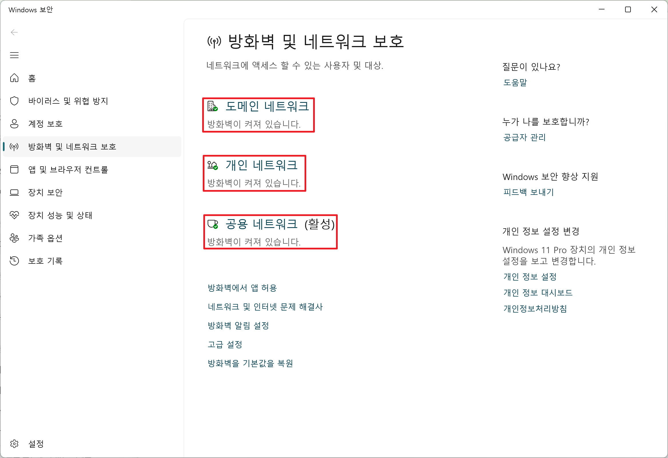 3. 각 네트워크 유형(도메인/개인/공용)에서 방화벽이 켜져 있는지 확인