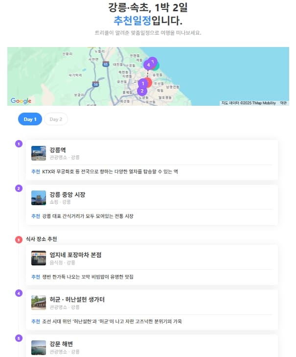 AI가 짜준 1박 2일 강릉, 속초 여행 일정 예시